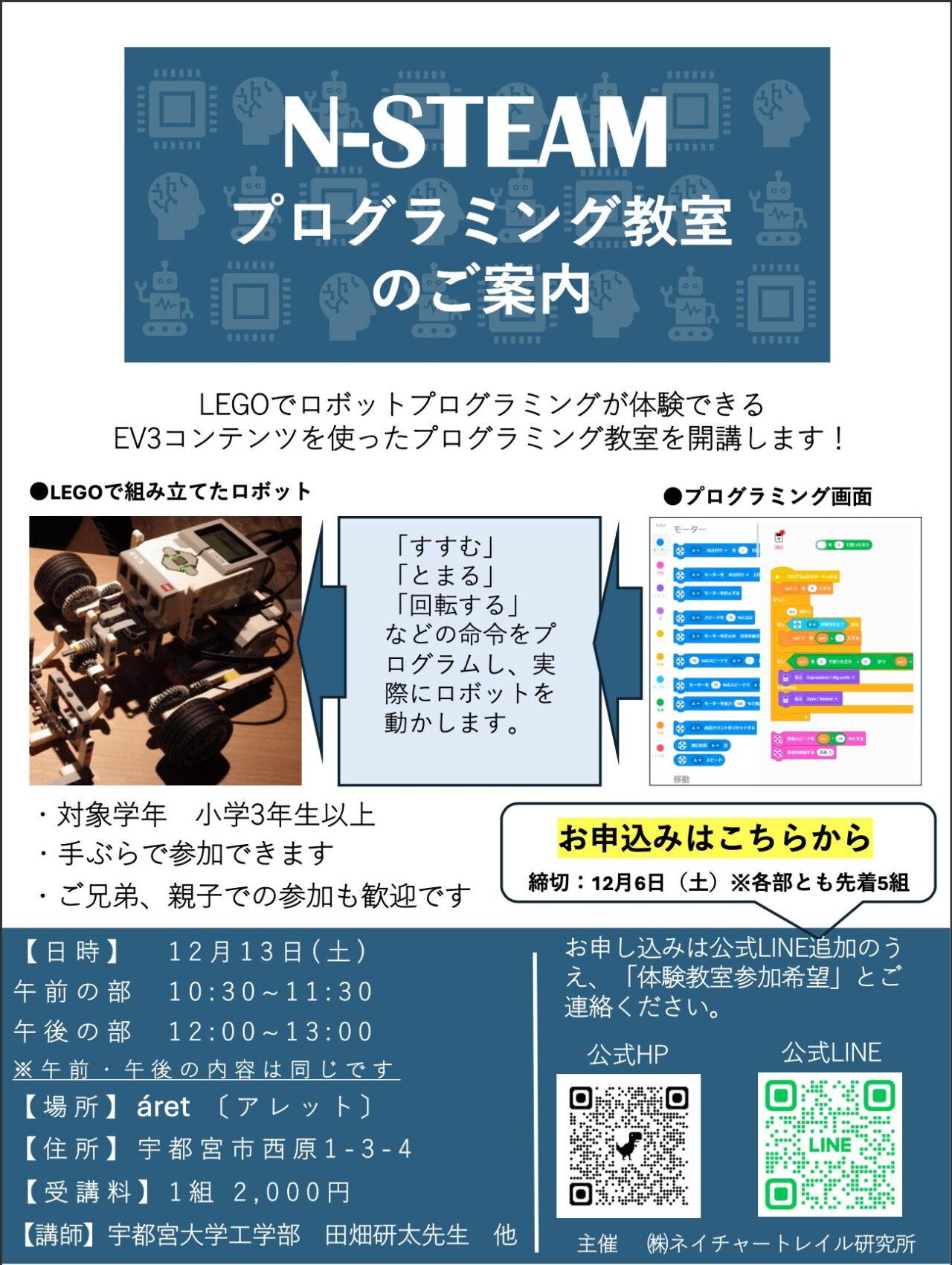 「N-STEAM研究会(Nature STEAM Education Lab)」が主催する体験型プログラミング教室です。